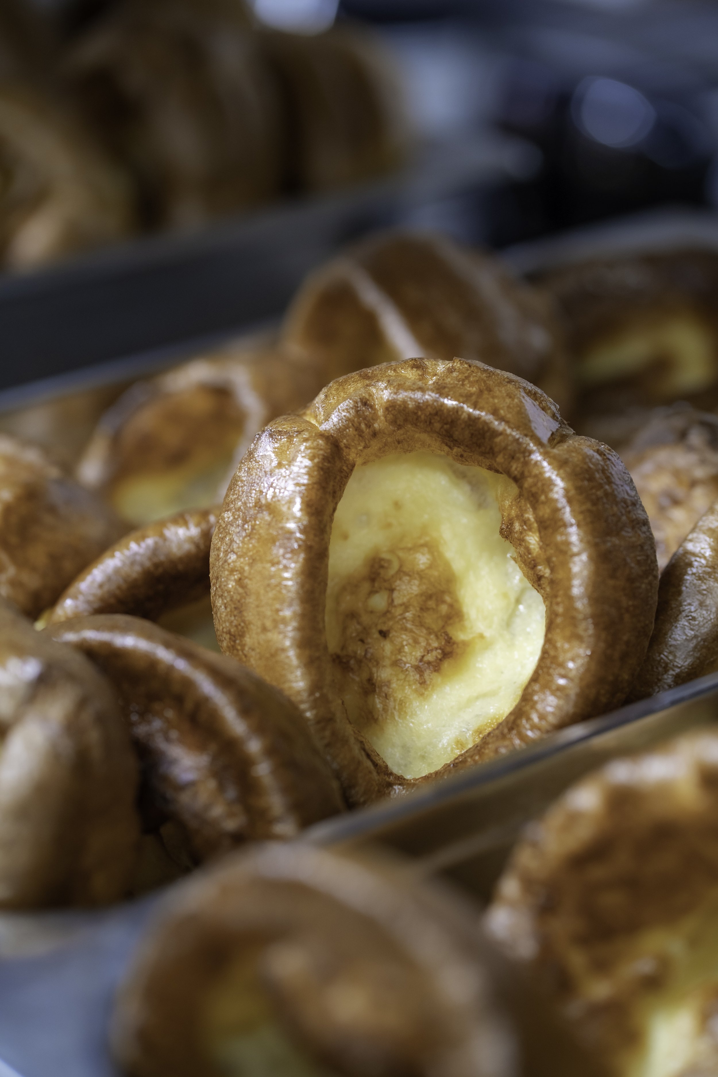 Close-up of baked caramel and custard-filled pastries arranged in a display tray.